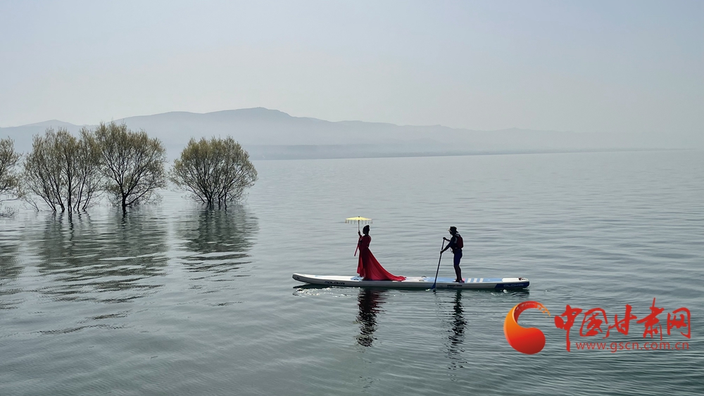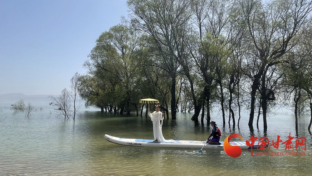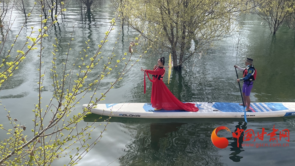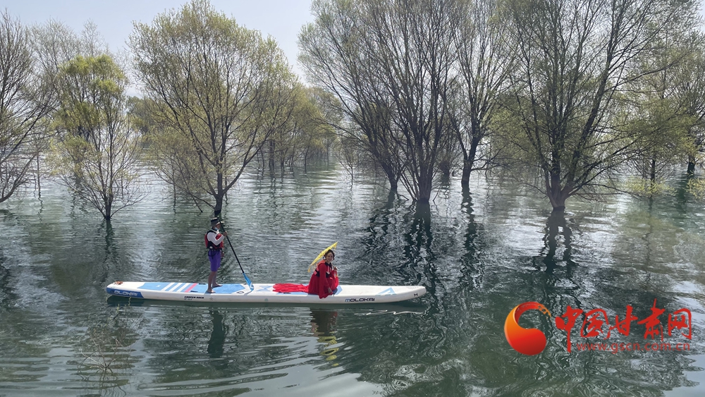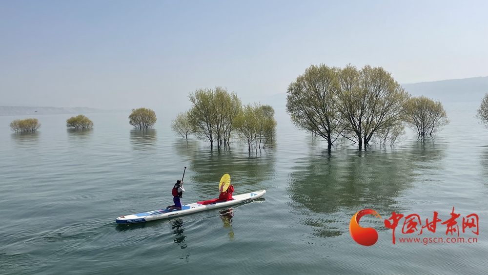 春日,炳靈湖水位上漲,碧波蕩漾,垂柳依依,槳板愛(ài)好者和游客在湖面上蕩舟嬉戲,游覽春色。