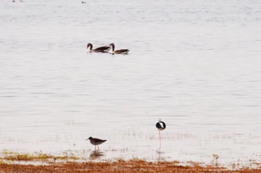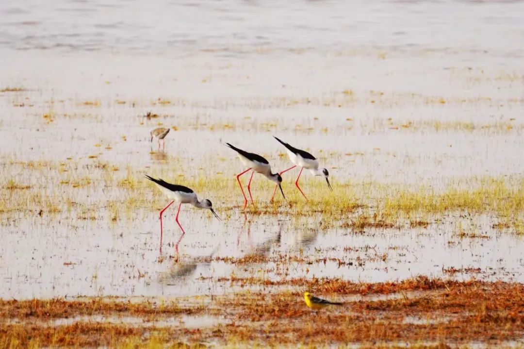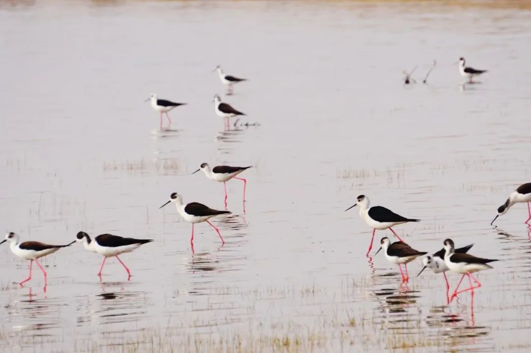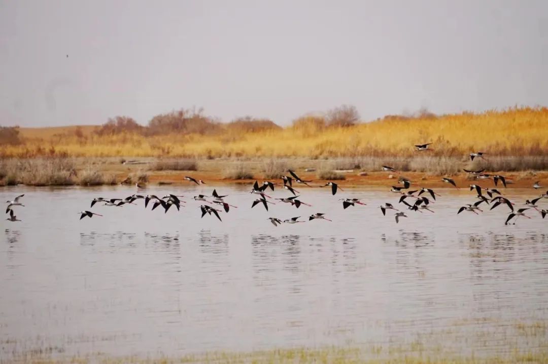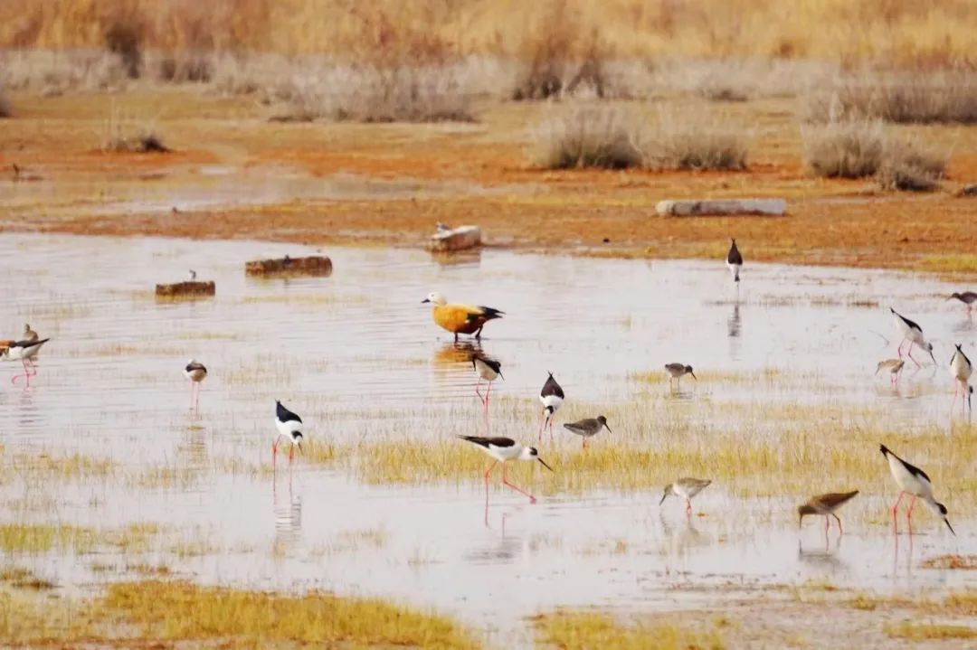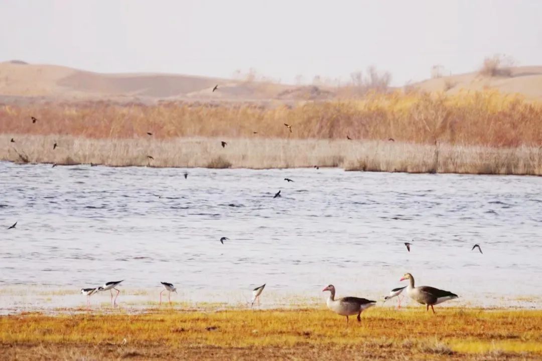 四月的敦煌大地春和景明,在庫(kù)姆塔格沙漠的邊緣,位于陽(yáng)關(guān)濕地的壽昌海子波平如鏡,碧水映襯著祁連山上的雪峰,各種色彩斑斕地鳥(niǎo)兒仿佛收到了春天的邀約,在這里參加一場(chǎng)盛大的聚會(huì)。它們有的在湖面上引頸入水自在覓食,有的踏波翩翩起舞,有的追逐嬉戲鳴唱,有的在岸邊閑庭信步、悠然自得地曬太陽(yáng)......構(gòu)成了一幅多姿多彩的和諧自然生態(tài)畫(huà)卷。