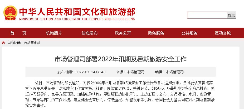 據(jù)文旅部網(wǎng)站消息,近日,文旅部市場管理司印發(fā)通知,對(duì)做好2022年汛期及暑期旅游安全工作進(jìn)行部署。