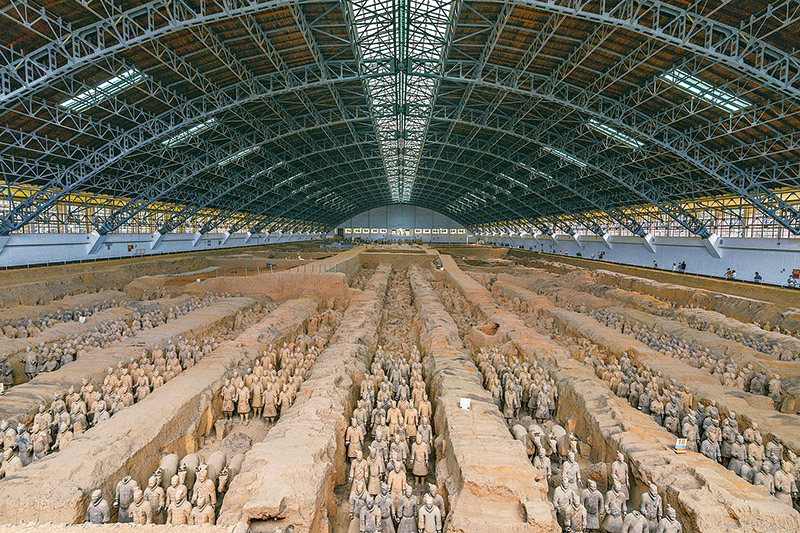秦始皇陵是中國(guó)歷史上第一個(gè)多民族的中央集權(quán)國(guó)家的皇帝秦始皇于公元前246年至公元前208年?duì)I建的。作為秦始皇陵陪葬墓坑之一的兵馬俑坑于1974年被發(fā)現(xiàn),被譽(yù)為“世界第八大奇跡”。圖為秦始皇兵馬俑博物館一號(hào)坑全景。 人民圖片 丁俊豪/攝