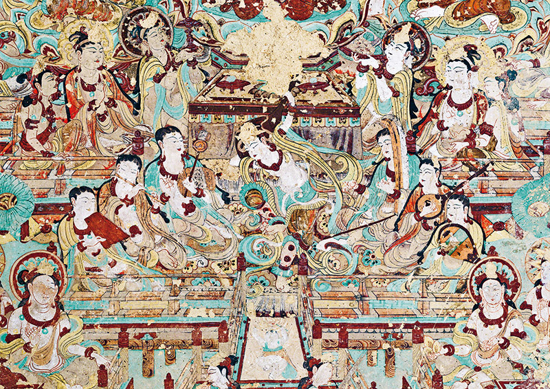 敦煌文化延續(xù)近兩千年,是世界現(xiàn)存規(guī)模最大、延續(xù)時(shí)間最長(zhǎng)、內(nèi)容最豐富、保存最完整的藝術(shù)寶庫(kù),是世界文明長(zhǎng)河中的一顆璀璨明珠,也是研究我國(guó)古代各民族政治、經(jīng)濟(jì)、軍事、文化、藝術(shù)的珍貴史料。圖為莫高窟第112窟南壁壁畫(huà)“反彈琵琶樂(lè)舞圖”?!《鼗脱芯吭汗﹫D