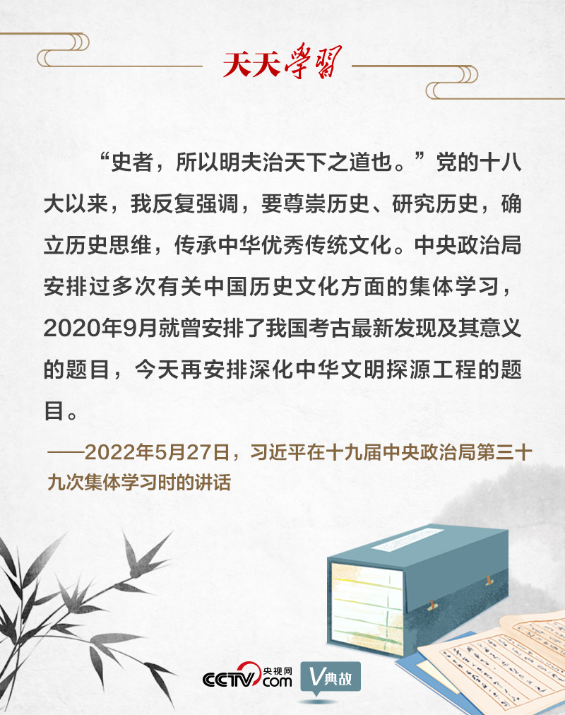 為深入了解中華文明五千多年發(fā)展史,推動把中國文明歷史研究引向深入,推動全黨全社會增強(qiáng)歷史自覺、堅定文化自信,2022年5月27日,十九屆中央政治局就深化中華文明探源工程進(jìn)行第三十九次集體學(xué)習(xí)。習(xí)近平總書記引用古語“史者,所以明夫治天下之道也”,強(qiáng)調(diào)要尊崇歷史、研究歷史,確立歷史思維,傳承中華優(yōu)秀傳統(tǒng)文化。