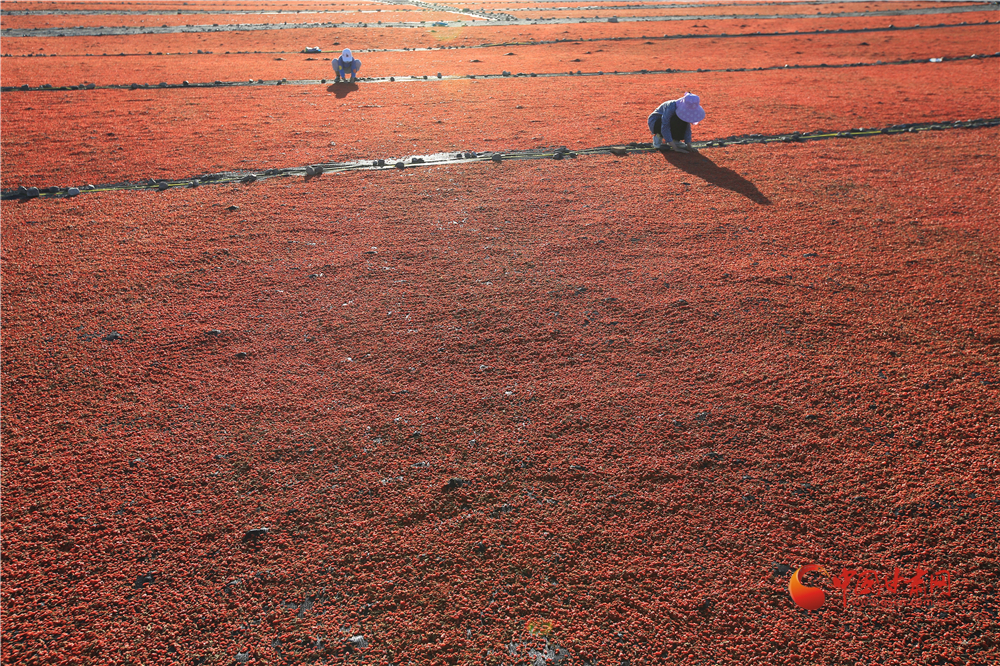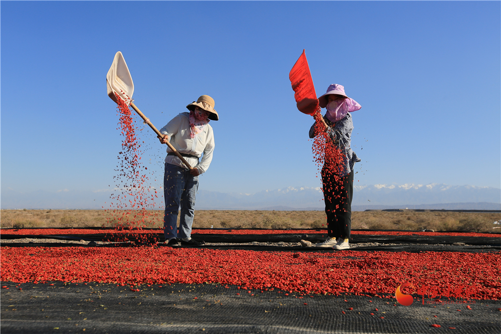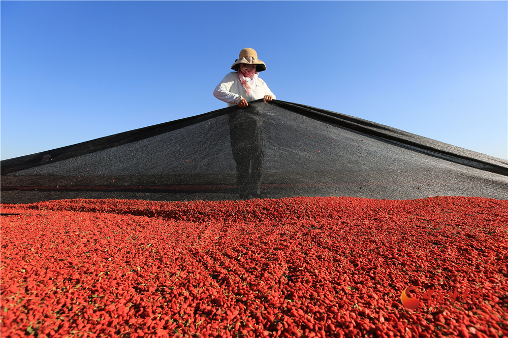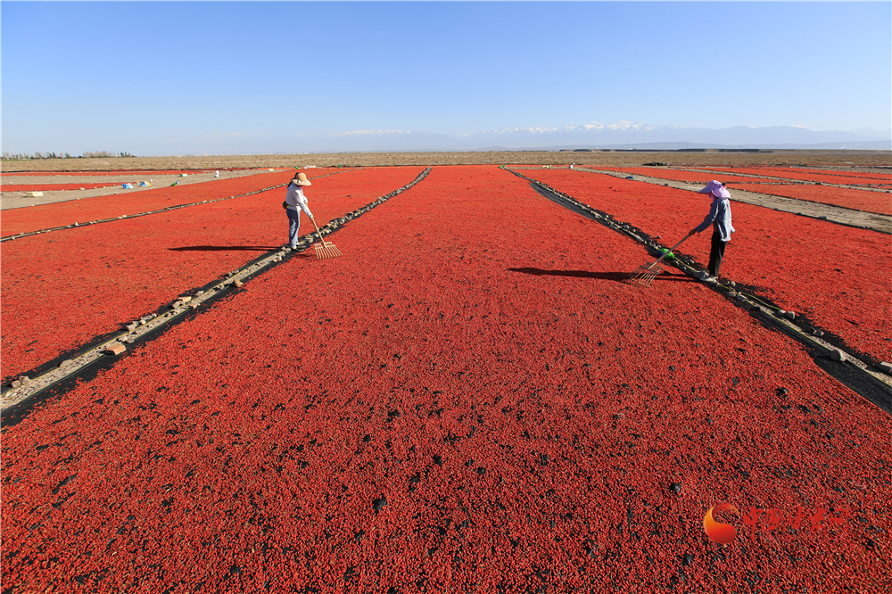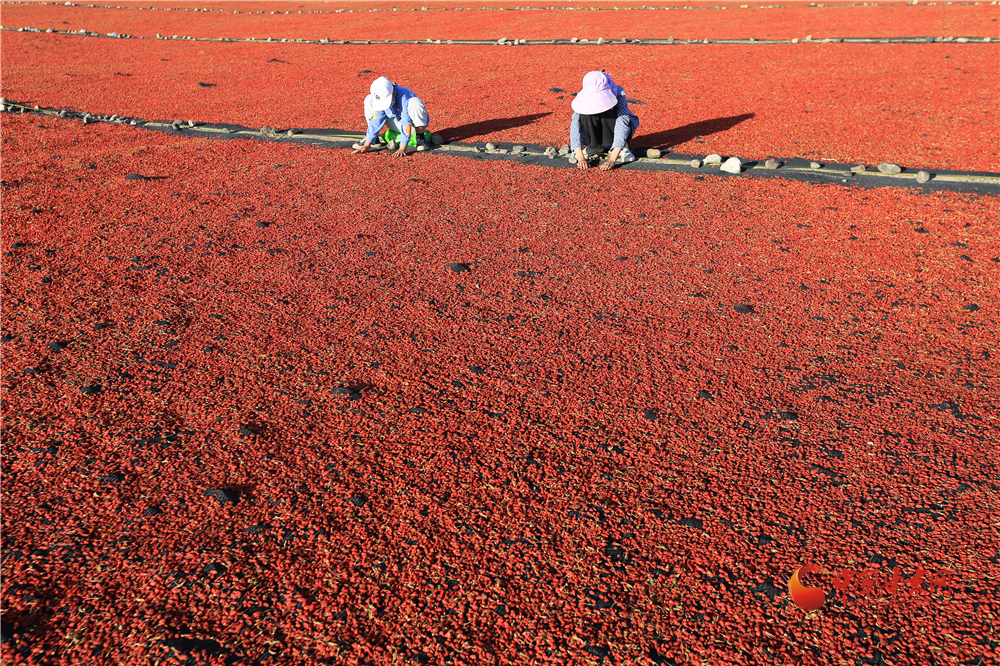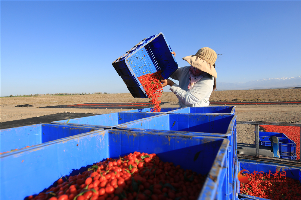 7月22日,在甘肅省嘉峪關(guān)市枸杞喜獲豐收,枸杞種植戶們搶抓雨后晴好天氣采摘、拉運(yùn)、晾曬、儲存,確保顆粒歸倉。