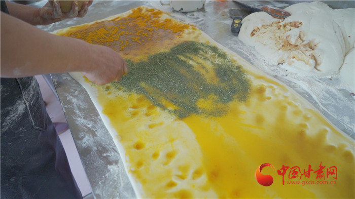 記者走進(jìn)榆中縣金崖鎮(zhèn)浩燕饅頭店,一股濃濃的胡麻油、玫瑰醬、香豆等混合的香氣撲面而來(lái),李浩燕正在忙碌地趕制一批榆中傳統(tǒng)手工月餅。案板上除了發(fā)好的面團(tuán),還擺上了炒胡麻碎、姜黃、白砂糖等豐富的佐料。只見(jiàn)李浩燕從揉面開(kāi)始,然后鋪餡、搟制、卷面、切分、披花,一道道工序一氣呵成。經(jīng)過(guò)一個(gè)多小時(shí),新鮮美味的月餅出爐了,切開(kāi)后,內(nèi)里豐富,色彩斑斕,咬上一口軟糯可口,回味留香。