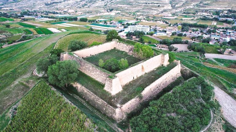 漫步騾子灘,附近的水家坡堡子也值得一去。這個堡子呈正方形,占地超4畝,不管從哪個視角看,都稱得上震撼。堡子分上下兩層,下層高5米、寬5米、邊長55米,上層高6米、底部厚3.5米、頂部厚2米、邊長35.5米。堡子外圍修有一圈寬5米、深6米、總長230余米的壕溝,曾為護(hù)城河。堡子約建于1946-1948年間,用來辦公和防御戰(zhàn)爭。1949年8月,解放軍在水家坡地界圍剿國民黨馬步芳部隊(duì),經(jīng)過一天一夜戰(zhàn)斗,馬步芳部隊(duì)潰敗逃往新營方向,當(dāng)時有一發(fā)炮彈落在堡子一角,至今炮坑清晰可見。
