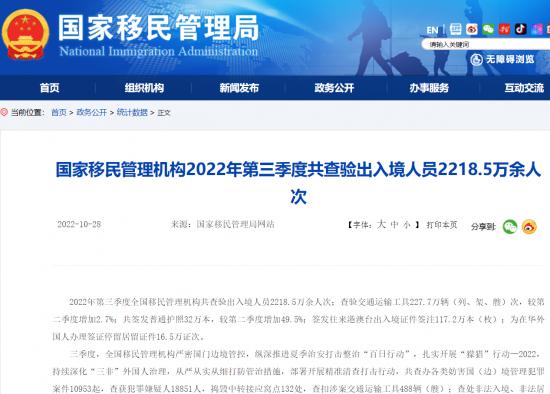 來自國家移民管理局的數(shù)據(jù)顯示,2022年第三季度,全國移民管理機構(gòu)共查驗出入境人員2218.5萬余人次;共簽發(fā)普通護照32萬本,較第二季度增加49.5%;簽發(fā)往來港澳臺出入境證件簽注117.2萬本(枚);為在華外國人辦理簽證停留居留證件16.5萬證次。