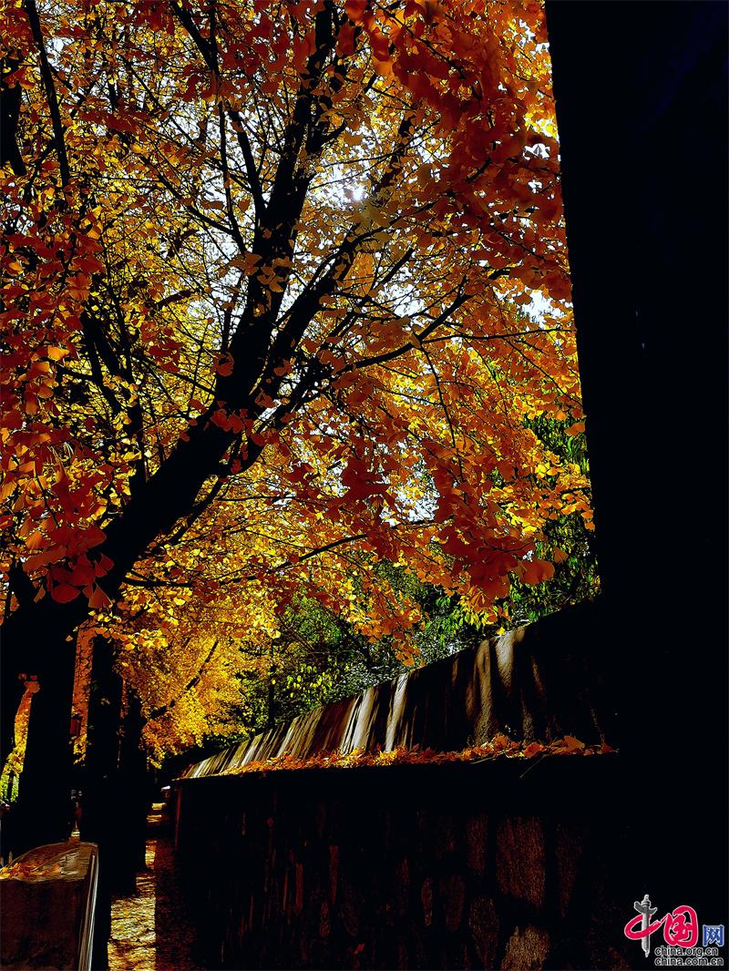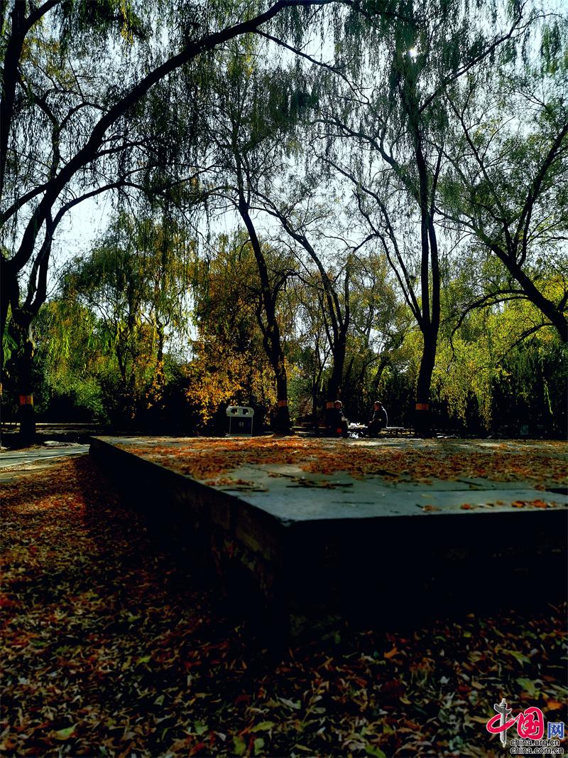而圓明園的秋色,同樣不落秋之美。黃葉與殘?jiān)嘁r,透露出特有的滄桑與悲涼。它美得那么寂寞,那么孤獨(dú)。只有在銀杏大道上,才能聽(tīng)到喧鬧之中,那熙熙攘攘的歡呼之聲。