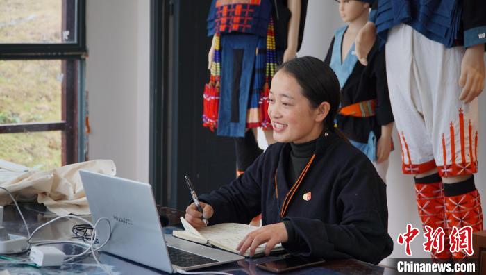 在朵努社區(qū)的織繡坊內(nèi),26歲的白褲瑤居民黎秋憶正在電腦前繪聲繪色地演講。此時的她正作為瑤族服飾非遺傳承人,參加廣西全區(qū)青年創(chuàng)業(yè)創(chuàng)新大賽。