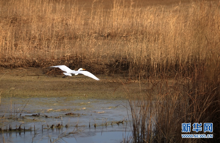 11月19日,一只白鷺在甘肅省敦煌市黨河濕地飛翔。新華網發(fā) (張曉亮 攝)