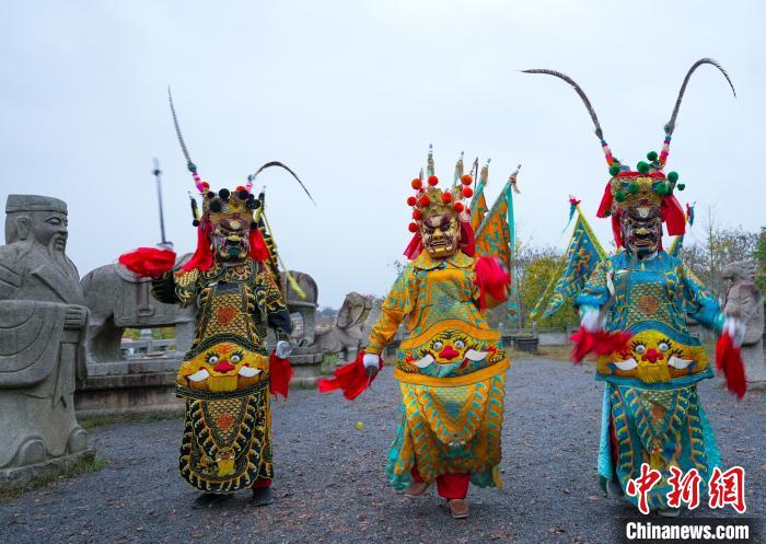 郎溪縣國家級非遺跳舞猖在郎溪縣濤城鎮(zhèn)慶豐村大佛山養(yǎng)心谷展演?!±顣约t 攝
