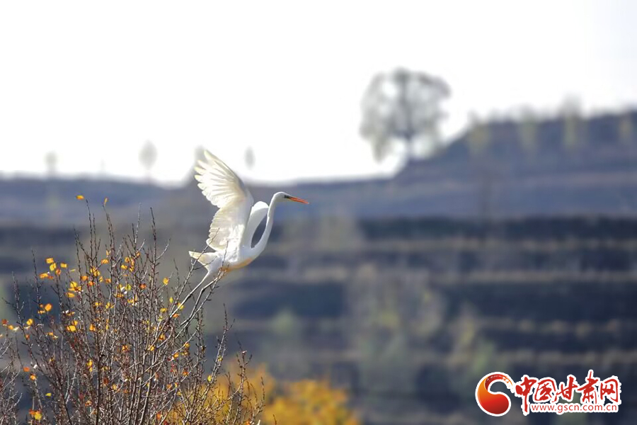 初冬時節(jié),在平?jīng)鍪谐缧趴h于家灣鷺鳥紛飛,繪就一幅人與自然和諧共生的美麗畫面。