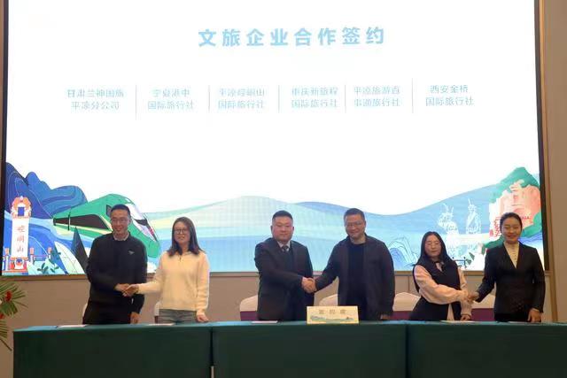 專題推介會(huì)上,平?jīng)鍪形幕瘡V電和旅游局推介了全市文旅資源及“引客入平”系列支持政策,崆峒山、大云寺·王母宮、龍泉寺、云崖寺等重點(diǎn)景區(qū)和涇川橙香瑤池溫泉酒店分別作了主題推介。平?jīng)鑫穆猛豆九c西安一帶一路文旅公司、涇川大云恒盛旅游公司與西安黃河國旅、崇信公劉文旅投公司與寶雞春暉旅行社、莊浪關(guān)山文旅投公司與寧夏新文化國旅、崆峒山國旅與重慶新旅程國旅、甘肅蘭神國旅平?jīng)龇止九c寧夏港中國旅、平?jīng)雎糜伟偈峦ㄅc西安金橋國旅等14家省內(nèi)外旅行社分別簽訂“引客入平”客源互送合作協(xié)議。推介環(huán)節(jié)還進(jìn)行了《神仙留戀的好地方》《崆峒武術(shù)魂》《折柳》和《春天的芭蕾》等文藝表演,與會(huì)嘉賓參觀了“問道崆峒·養(yǎng)生平?jīng)?rdquo;文旅形象圖片展、文旅產(chǎn)品市集、非遺技藝展示及網(wǎng)絡(luò)直播和非遺文創(chuàng)產(chǎn)品展。甘肅省文旅廳有關(guān)處室、各相關(guān)市州文旅部門負(fù)責(zé)人和省內(nèi)外旅行商、文旅企業(yè)、媒體記者代表,平?jīng)鍪兄攸c(diǎn)景區(qū)、文旅投公司、文創(chuàng)企業(yè)代表共150余人參加。