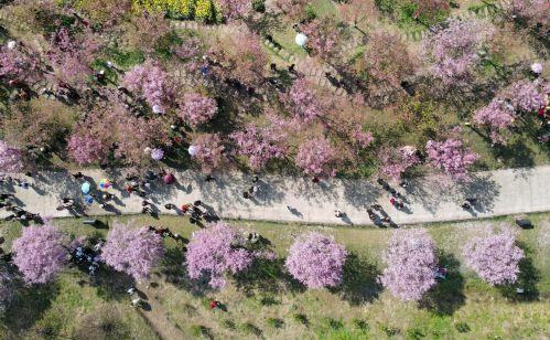 這是3月8日拍攝的都江堰市青城山鎮(zhèn)“問(wèn)花村”櫻花大道一角(無(wú)人機(jī)照片)