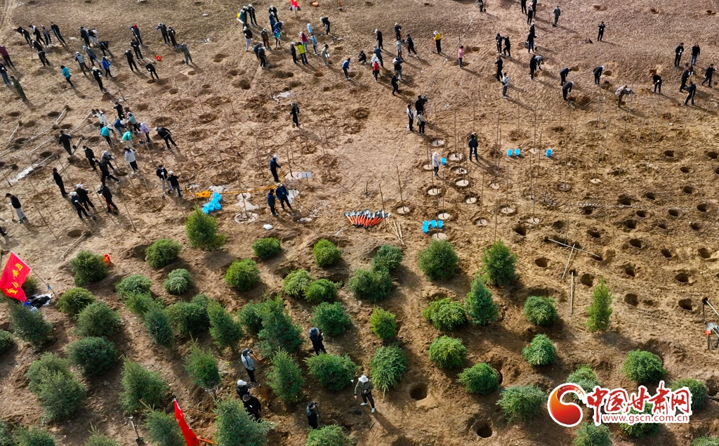 4月11日,在甘肅省張掖市甘州區(qū)黑河西岸黑河灘彩虹林海生態(tài)造林示范區(qū)內(nèi),眾多干部職工正在植樹。