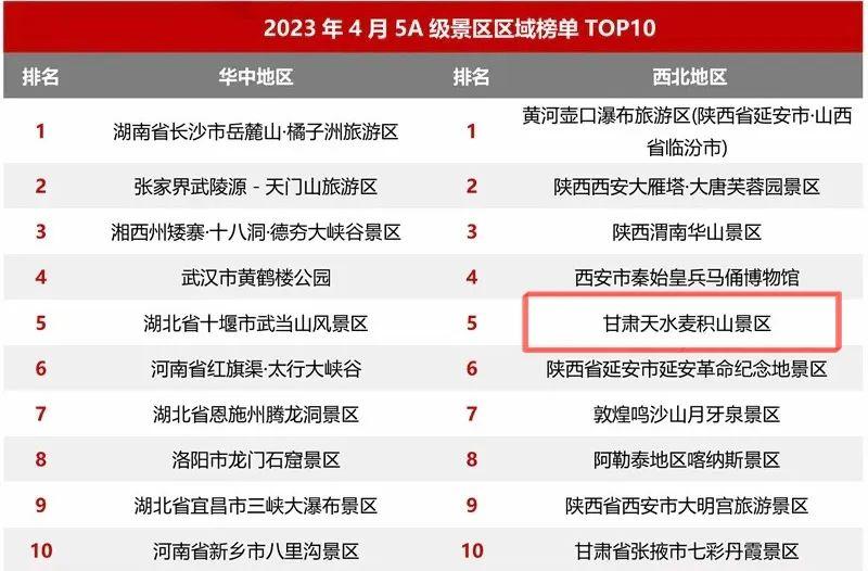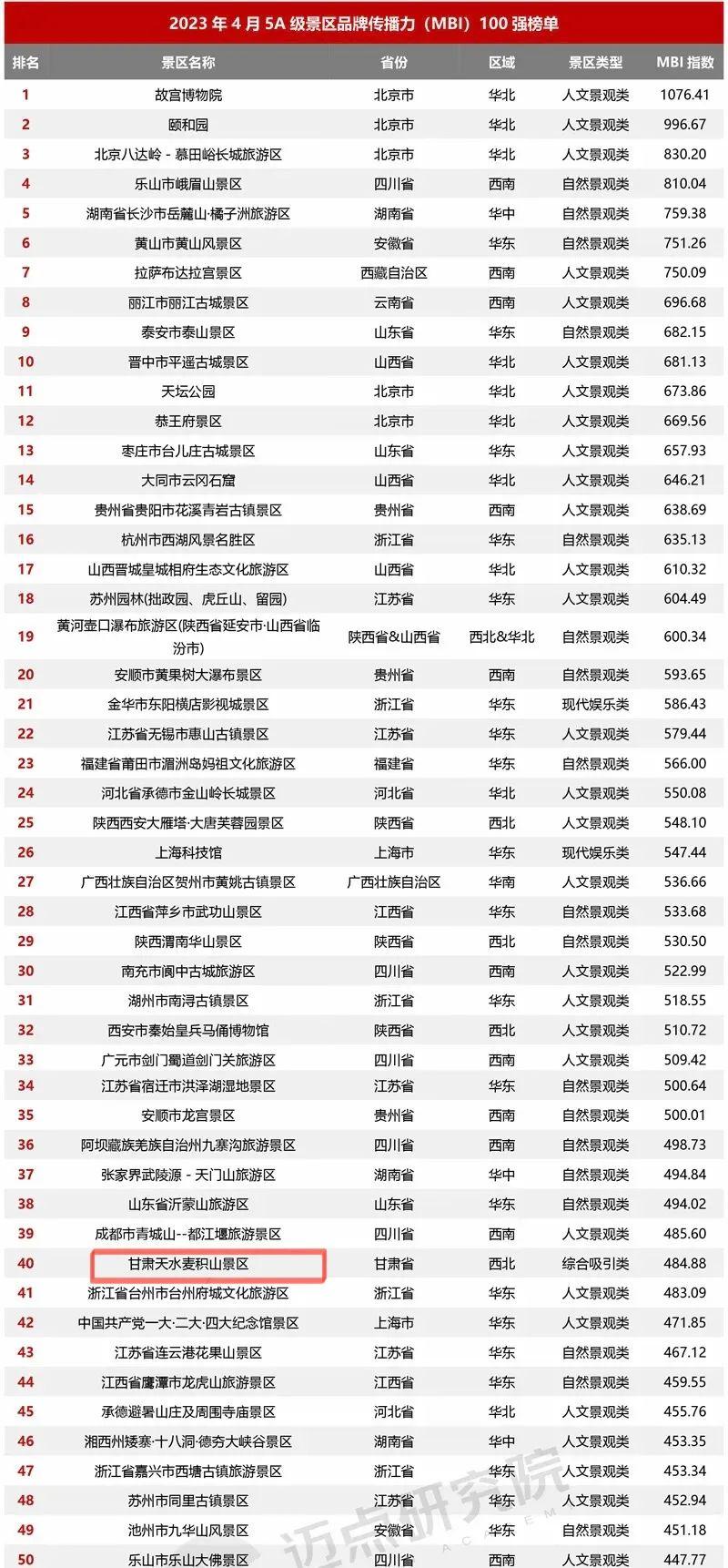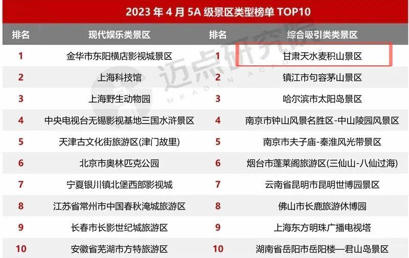 2023年4月5A級(jí)景區(qū)品牌傳播力100強(qiáng)榜單上,熱烈祝賀麥積山景區(qū)榮登國內(nèi)文旅行業(yè)最具影響力的權(quán)威數(shù)據(jù)分析機(jī)構(gòu)“邁點(diǎn)研究院”4月5A級(jí)旅游景區(qū)品牌傳播力百強(qiáng)榜單前五十和綜合類旅游景區(qū)第一、西北地區(qū)分項(xiàng)榜單第五