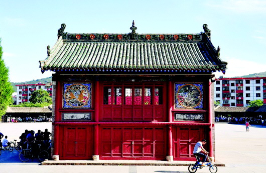 在伏羲城中,伏羲廟無疑是這座古城的中心和靈魂。廟區(qū)坐北朝南,總占地3萬多平方米,由廟前祭祀廣場(chǎng)、戲樓和三座牌坊構(gòu)成的廟前區(qū)和伏羲廟的廟區(qū)三大部分組成。在伏羲廟明清古建筑群中,第一座古建筑便是戲樓。