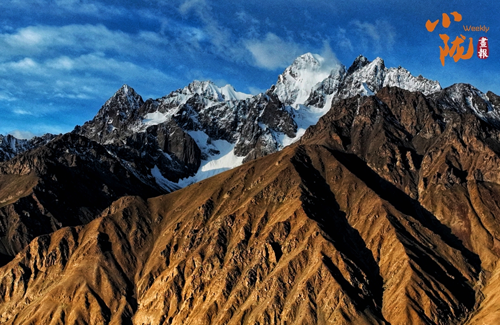山頂白雪皚皚,熠熠生輝,裸露的山骨終年積雪不化;山下樹綠花開,青山碧水,風(fēng)景如畫。
