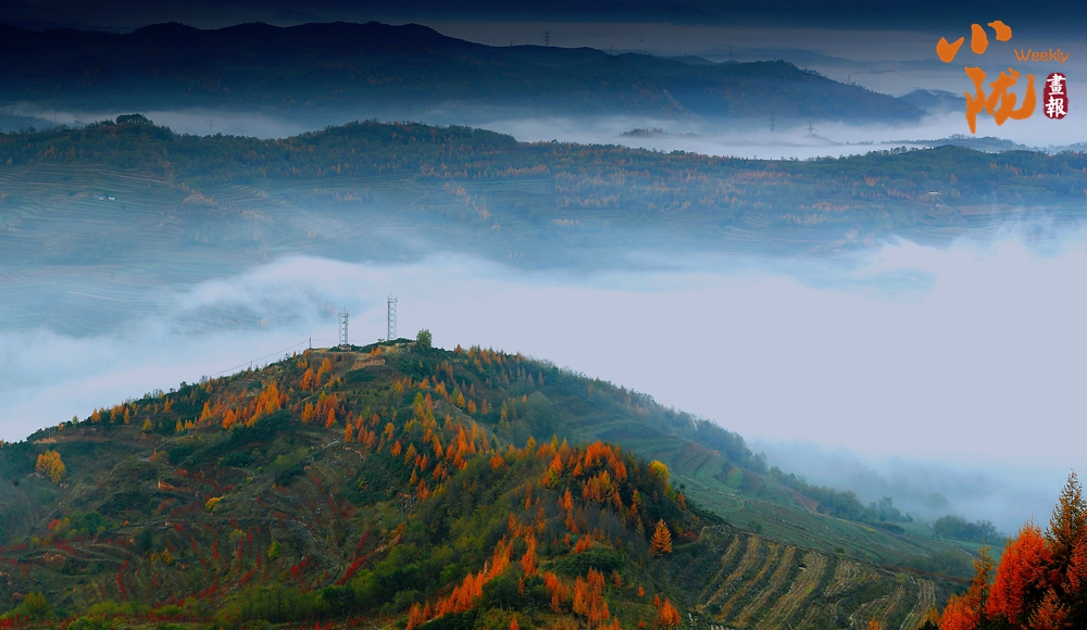 天空中布滿了烏云,云隙中的陽(yáng)光和從四面八方漫過來的云霧、滿山彩林,把云華山點(diǎn)綴得像一幅筆墨清爽、疏密有致山水畫。