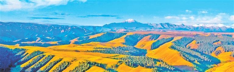 初冬的祁連山,顯示出獨(dú)特韻味。主峰在藍(lán)天白云的映襯下顯得肅穆大氣。周?chē)悍辶_列、層巒疊嶂,高低延綿的山脈在陽(yáng)光的照耀下交相輝映,近處的群山被此起彼伏的林海包圍,像一道道美麗的波浪。祁連山脈山高、天藍(lán),大自然賜予這片土地最原始的靈秀與遼闊。