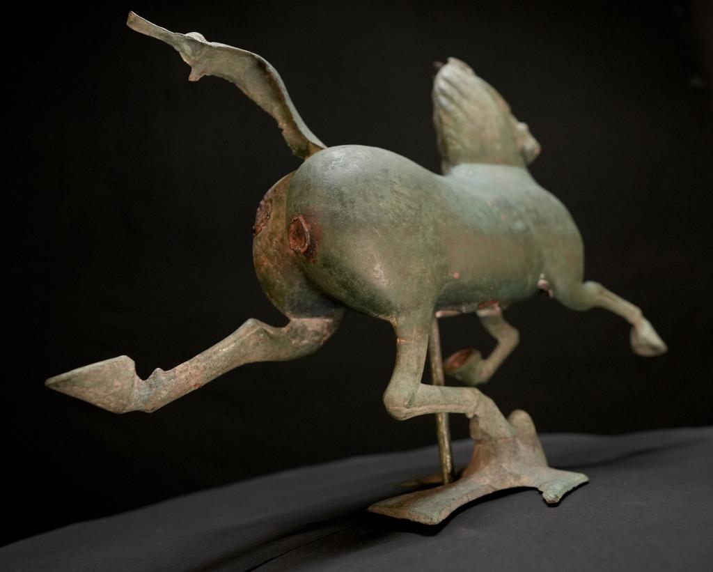 馬兒如在空中飛馳,一足踏上飛鳥(niǎo)的剎那,飛鳥(niǎo)回首驚顧。細(xì)細(xì)觀之,馬的口、眼、鼻均張開(kāi),鬃毛和尾絲后揚(yáng),令人仿若聽(tīng)見(jiàn)馬兒奔騰的嘶鳴和風(fēng)嘯聲,靜態(tài)的青銅器充滿靈動(dòng)之感。