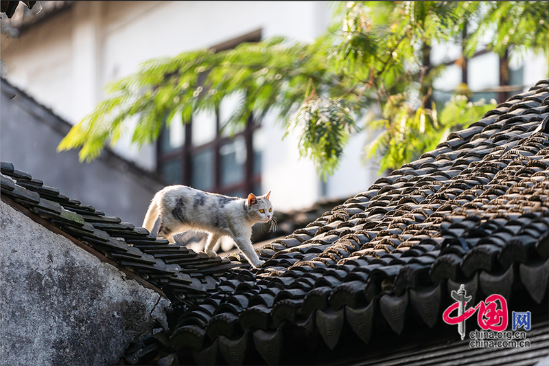 在毛孩子眼里,這就是包容一切活動(dòng)的「游樂(lè)場(chǎng)」,片片青瓦上留下梅花印?;蛟S你也該往古鎮(zhèn)的屋頂上瞧,檐角翹伸、清風(fēng)古韻,讓人心曠神迷?;蛲侵回堃粯优噬细咛帲拼翱茨撬菢?,那木門(mén)青瓦,就是江南水鄉(xiāng)的具象。