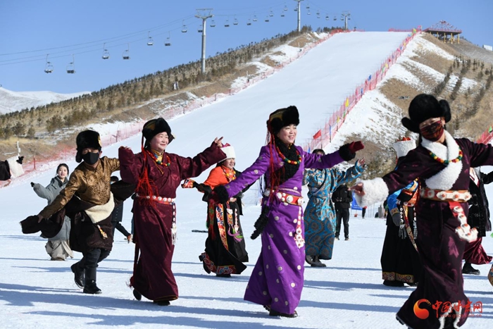 銀裝素裹的“冰雪嘉年華”現(xiàn)場,來自當(dāng)?shù)氐母刹咳罕娚碇?jié)日的盛裝和游客們一起,隨著音樂的旋律,跳起了鍋莊。游玩區(qū),大人小孩參與其間,體驗(yàn)雙板滑雪、雪圈、雪地自行車等多種娛樂項(xiàng)目,歡聲笑語彌漫著整個(gè)雪場。