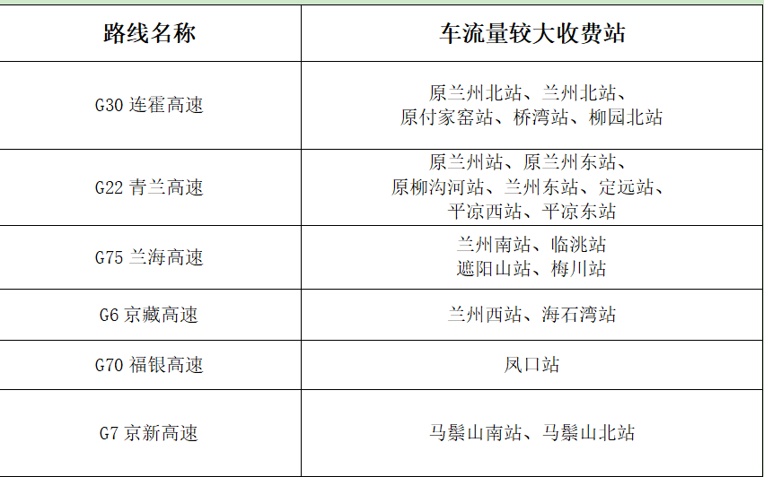 ?。ㄒ唬└咚俟分攸c路段。以蘭州為中心的放射線及其聯(lián)絡線為重點。如:G30連霍高速,G22青蘭高速,G6京藏高速,G70福銀高速,G75蘭海高速,S1機場高速等路段及相關收費站、服務區(qū)。