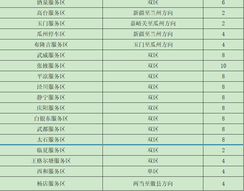 ?。ǘ┲攸c客運車站班線。省內二級及以上客運站正常營運,以省會城市、人口密集市縣的站點及之間的班線為重點。如:蘭州客運東站、南站,天水汽車站等站點以及蘭州—定西、蘭州—西峰、臨洮—平川、舟曲—武都、金昌—武威等客運班線。 (三)車流量較大服務區(qū)。預計我省車流量較大服務區(qū)為定西服務區(qū)、酒泉服務區(qū)、武威服務區(qū)、高臺服務區(qū)、長城驛服務區(qū)、靜寧服務區(qū)、會寧服務區(qū)、太石服務區(qū)、蘭州北服務區(qū)、接駕嘴服務區(qū)、永登服務區(qū)。