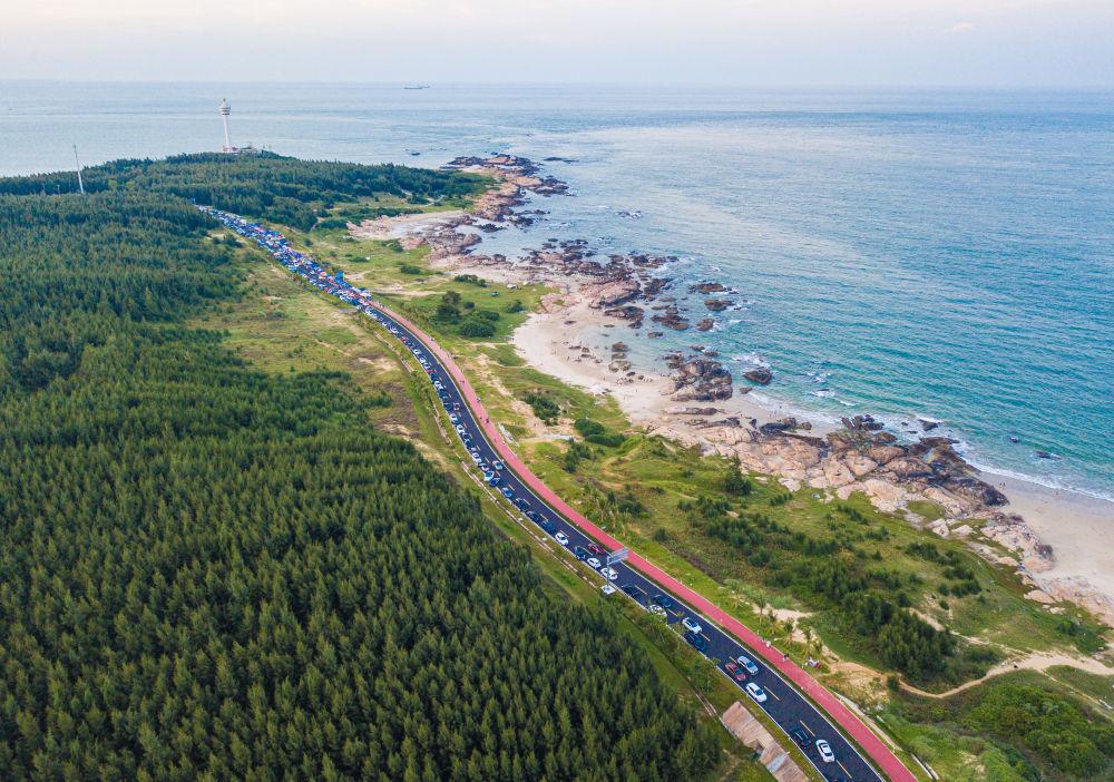 ↑2023年10月4日拍攝的海南環(huán)島旅游公路文昌段景色和自駕游車輛(無(wú)人機(jī)照片)。新華社記者 蒲曉旭 攝