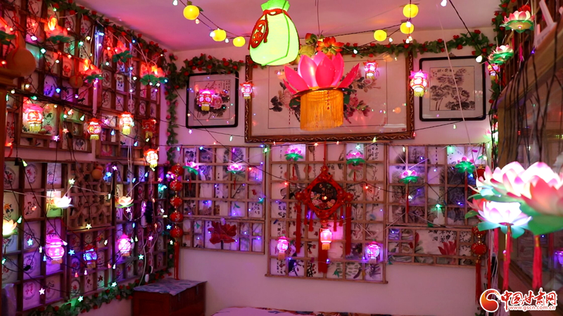 走進(jìn)馬玉琳的家,精美的宮燈、雅致的荷花燈、喜慶的掛件、彩色的燈帶錯落有致地掛在木制格子架上,濃濃的年味兒撲面而來,數(shù)百盞彩色花燈同時點(diǎn)亮,將屋內(nèi)裝扮成“滿房燈火迎新春”的喜慶景象。