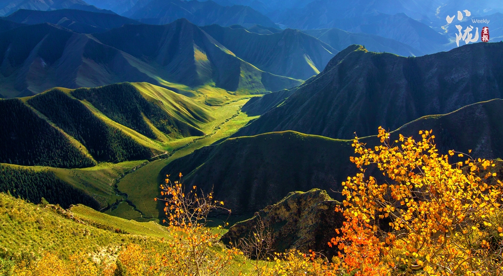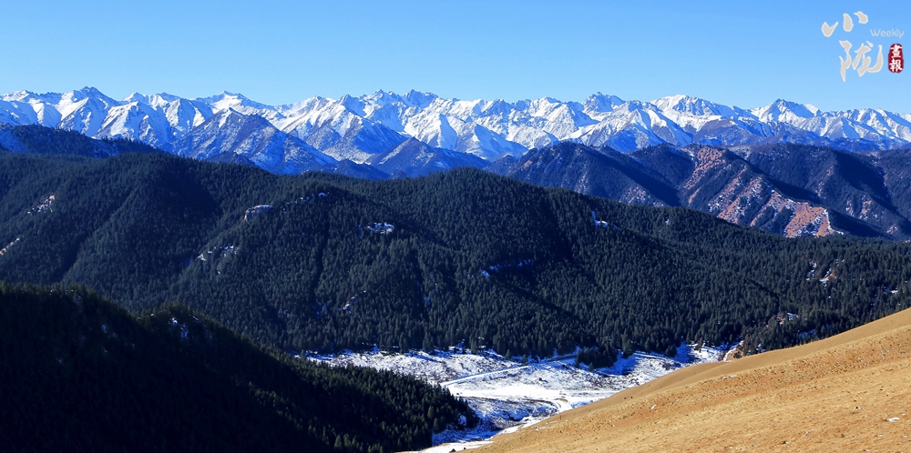 祁連主峰在藍(lán)天白云的映襯下顯得肅穆大氣。周圍群峰羅列、層巒疊嶂,高低延綿的山脈在陽光的照耀下交相輝映,近處的群山被此起彼伏的林海包圍,像一道道五彩的波浪,郁郁蔥蔥,生機(jī)盎然。