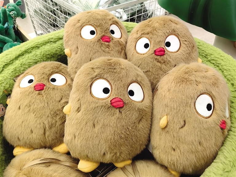 此時(shí),目不暇接的花式文創(chuàng)在店內(nèi)“爭(zhēng)奇斗艷”,爭(zhēng)當(dāng)“顯眼包”,等待被主人帶回家。掀開店內(nèi)一只毛絨收納箱,一窩土豆子撲閃著大眼睛向你眨眼。都說(shuō)轉(zhuǎn)角遇到愛(ài),誰(shuí)料,轉(zhuǎn)角處粉嘟嘟的“拿捏玩偶娃娃公仔”捏著一個(gè)小蓮花花苞在向你招手。一回頭,造型別致的文創(chuàng)飾品精美又時(shí)尚,一側(cè)的帆布包上印著“別卷我”。就連記者逛下來(lái),都入手兩件文創(chuàng)。