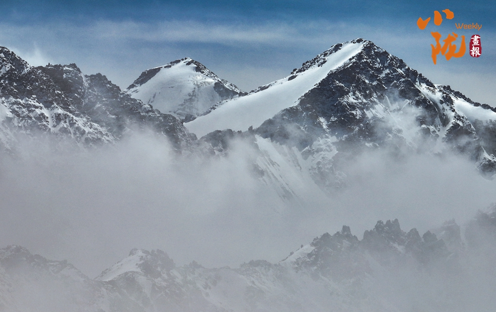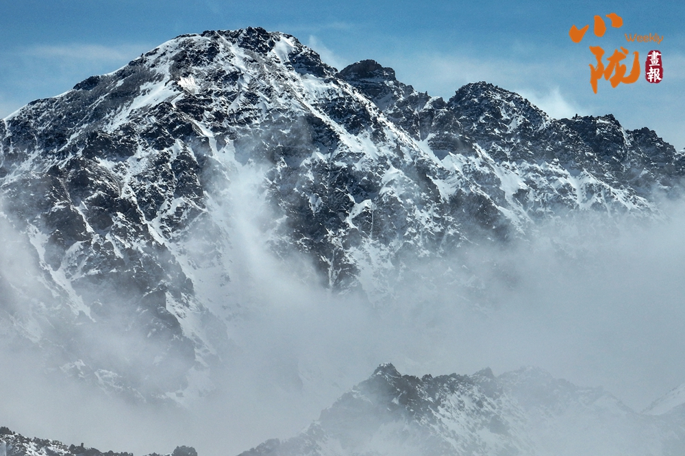 雪山山巒間,云霧回旋飄動,彌漫舒展,如海浪起伏、波濤滾滾一般,與湛藍(lán)天空相互映襯,壯美如畫。
