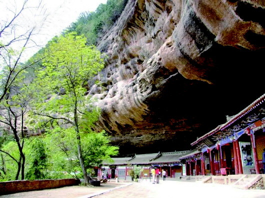 那天,自然之神行走于隴山渭水間,他雙手揮動,如雕如塑,將山川大地刻畫得瑰麗而神奇。當(dāng)他完成麥積山的杰作后,輕輕一拂指尖,卻不小心將一座砂崖的底部抹去,使之形成一面巨大的石檐。這石檐下,形狀恰似蛤蟆之嘴,能藏千軍萬馬,充滿了神秘與威嚴(yán)。