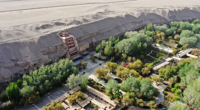 敦煌莫高窟窟區(qū)(無(wú)人機(jī)照片)。記者 陳斌 攝