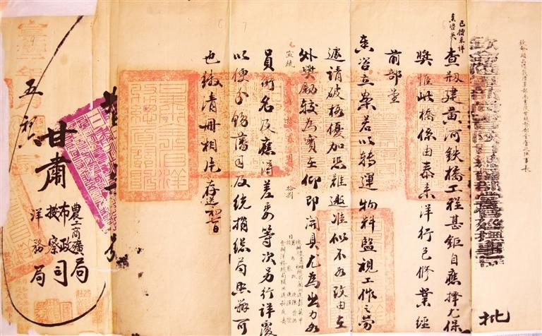 清宣統(tǒng)二年(1910年)5月,陜甘總督長庚褒獎(jiǎng)修建黃河鐵橋官員批文。
