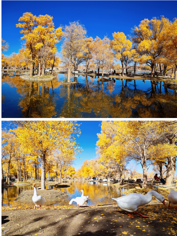 金波湖是金塔胡楊林的心臟,是臨水胡楊的最佳拍攝地之一。湖面倒映著胡楊高大的身影,多姿的樹干,黃色的樹葉,都毫不保留地在水中展示出來。小橋流水、碧波蕩漾、白鵝嬉戲,若不是周邊金黃色的胡楊提醒,會讓人誤以為來到了江南水鄉(xiāng)。