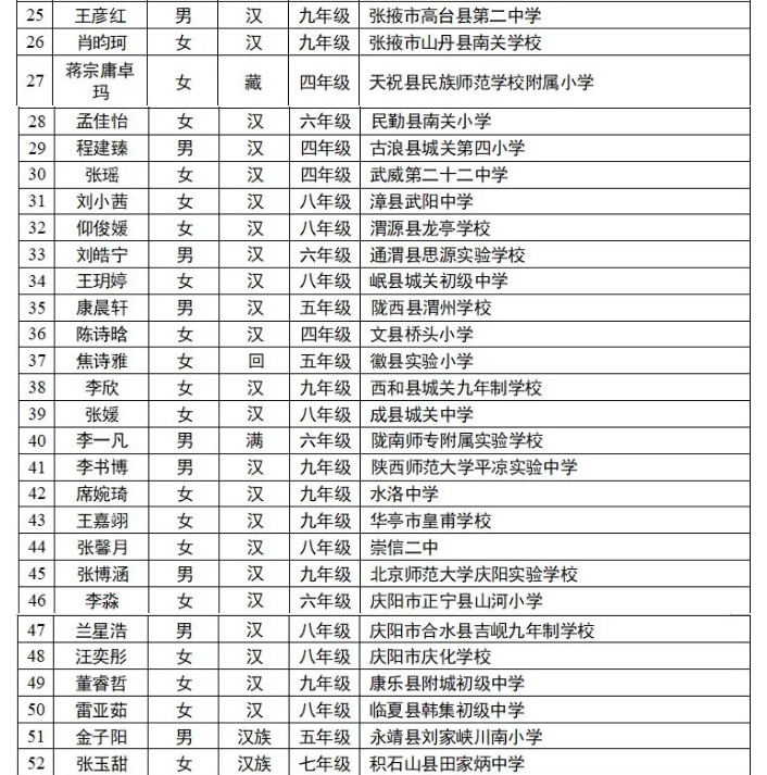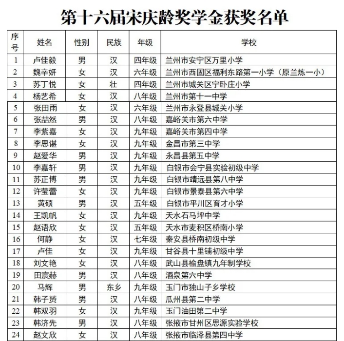 甘肅56人第十六屆宋慶齡獎(jiǎng)學(xué)金獲獎(jiǎng)名單