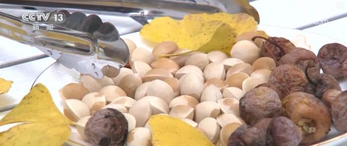 身在銀杏村,這里的鄉(xiāng)親們也是開發(fā)研制出了很多既安全又美味,還能發(fā)揮銀杏果“藥食兩用”特性的特色美食。村子里最常見的,是用炭火慢慢翻炒出的干果。還有將銀杏果、松子、核桃和芝麻等食材混合炒熟,再用木錘使勁敲平制成的銀杏酥,味道也是油潤香甜。