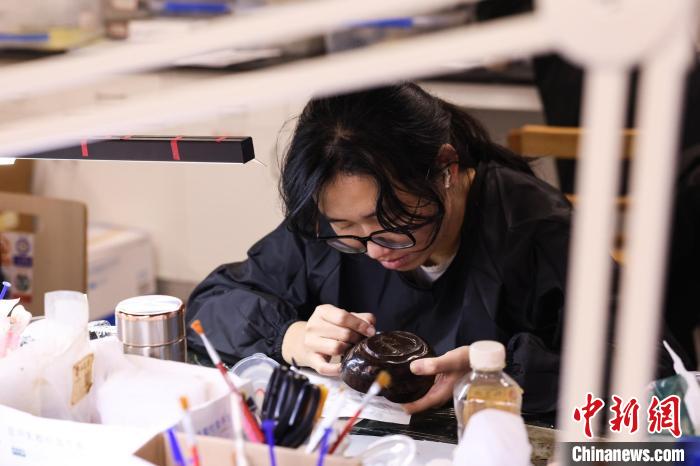 江西省文物考古研究院的丁金果也是“00后”,且參與了新展出漆器的修復(fù)。她表示,?;韬钅钩鐾恋钠崞髟谒薪萘嗽S久,大多數(shù)漆器已經(jīng)嚴(yán)重變形、破碎。經(jīng)過清洗、脫水、矯形、粘接、髹漆等諸多步驟,這些漆器便能再現(xiàn)原貌,但也需要大量的時間去修復(fù)。