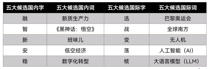 國內字詞前五位分別是“融、智、新、安、穩(wěn)”和“新質生產(chǎn)力、《黑神話:悟空》、班味兒、低空經(jīng)濟、數(shù)字化轉型”;國際字詞前五位分別是“選、戰(zhàn)、變、蕩、核”和“巴黎奧運會、全球南方、無人機、人工智能(AI)、大語言模型(LLM)”。