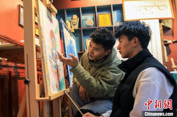 四川省甘孜藏族自治州理塘縣勒通古鎮(zhèn),是一個融合了特色傳統(tǒng)文化和現(xiàn)代創(chuàng)新的重要旅游目的地。近年來,理塘縣強化地域特色文化的保護,并引導當?shù)鼐用翊蛟炝艘幌盗刑厣幕糜涡马椖?。唐卡、皮具工藝、藏文書法及土陶制作等傳統(tǒng)工藝項目不僅得到了保護,還吸引了大量游客前來觀賞和交流。圖為12月22日,在勒通古鎮(zhèn)的“唐卡館”,畫師昂旺登登(左)指導洛絨曲扎繪制唐卡。中新社記者 王磊 攝