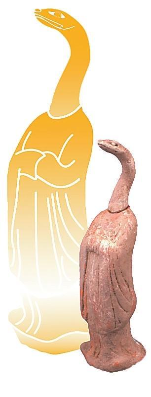 伏羲和女媧是中國神話傳說中的創(chuàng)世神靈,被視為人類文明的始祖。相傳他們均為蛇身人首的形象,象征著自然與人類的和諧統(tǒng)一。伏羲被認(rèn)為是發(fā)明八卦、結(jié)繩記事的智者,開啟了中華文明的智慧之門;而女媧則以其神力摶土造人,煉石補(bǔ)天,維護(hù)了天地的秩序。展覽中展出的高臺縣博物館館藏的一件魏晉時(shí)期的女媧圖彩繪壁畫磚。畫面繪女媧,人首蛇身,獸足,頭梳高髻,著交領(lǐng)紅裳,右手持月輪,月輪內(nèi)有蟾蜍,左手持規(guī),周圍繪云氣。同時(shí),還展出了一件高臺縣博物館館藏魏晉時(shí)期的伏羲女媧畫像磚,左側(cè)女媧,一手持矩、一手拿陰物,人首、蛇身、獸足、挽高髻、著交領(lǐng)長衣,腹部繪月輪;右側(cè)伏羲,右手持規(guī),左手持日,內(nèi)有一金烏,周圍云氣環(huán)生,意在天界暢游。兩磚拼合形成陰陽交合圖,為墓葬中室頂部藻井彩繪圖像。畫像中人首蛇身的伏羲、女媧形象,濃縮著中國上古時(shí)代的蛇崇拜意識。我國古代有天圓地方之稱,伏羲執(zhí)規(guī)象征天,女媧執(zhí)矩象征地,反映了墓主人追隨升天的愿望,也期望其后代能夠繁衍生息。