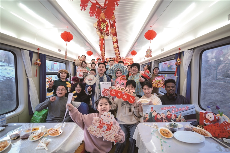 在歌聲、鼓聲、歡笑聲中,出鍋的餃子讓跨年列車的車廂年味更濃,把“春運回家”這一樸素而又濃烈的幸福感,通過舌尖味蕾傳遞,把“團(tuán)圓便是年”“回家的路就是最美的風(fēng)景”,通過餃子這一代表著中國人情愫強(qiáng)烈的文化符號,將天南海北奔赴山海的人們團(tuán)聚在列車、歡度在旅途。