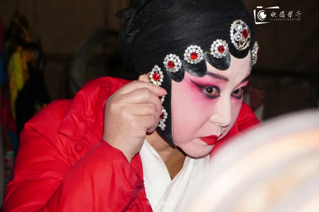 演員們或?qū)︾R描眉,或整理戲服
