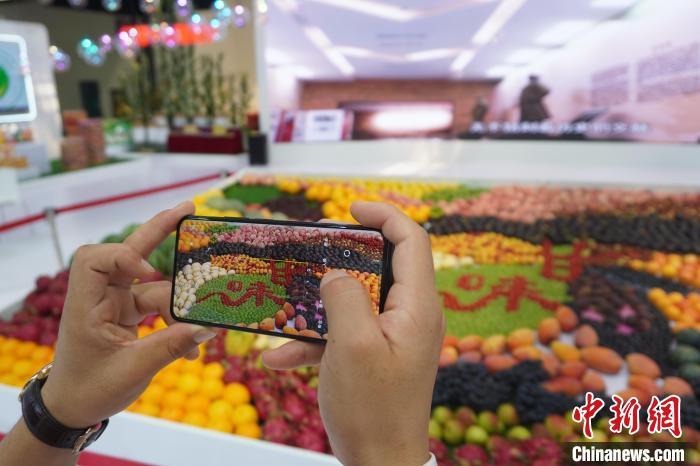 2022年7月10日,第二十八屆中國蘭州投資貿(mào)易洽談會展區(qū)展示甘肅地方特色產(chǎn)品。圖為參觀者手機(jī)拍攝用農(nóng)產(chǎn)品拼裝的“甘味”。(資料圖)九美旦增 攝