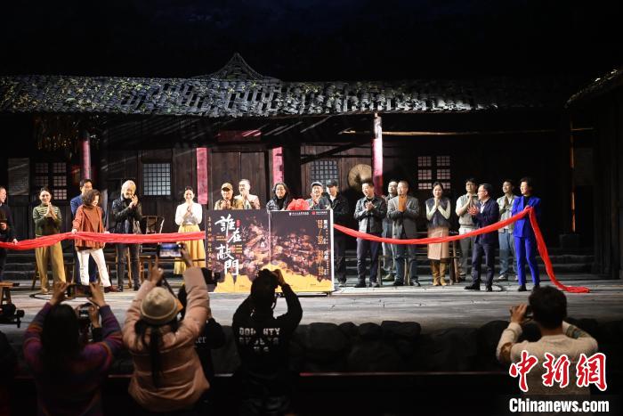 圖為團(tuán)隊(duì)舉行揭幕儀式,慶祝話劇《誰(shuí)在敲門(mén)》的全國(guó)首演。張旭 攝