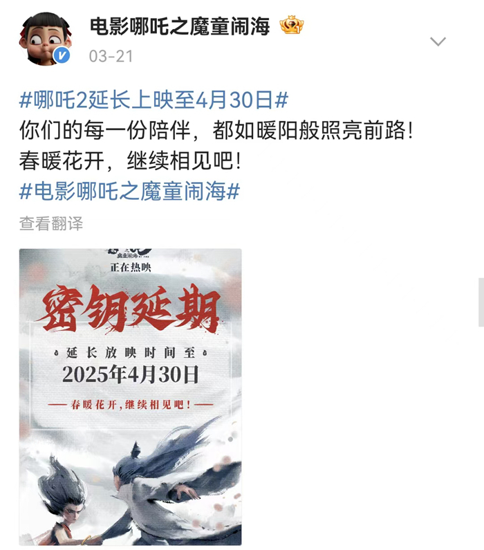 延長上映的《哪吒之魔童鬧?!放c即將重映的《熱烈》,成為這個清明檔不可小覷的隊伍。上映近兩個月來,《哪吒之魔童鬧?!芬廊焕卫巫€(wěn)票房日冠,不斷刷新影史記錄,為了更好的觀看體驗,許多觀眾“為一塊屏奔赴一座城”,在清明節(jié)假期,這樣的影旅聯(lián)動依然有可能繼續(xù)。