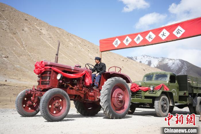 紅色“55輪式拖拉機(jī)”名叫“鐵牛”,前杠上寫著“出生年月”:1979年10月。微電影《五十七公里》中,張?zhí)煳妮d著戲中主持修路的陶書記,在牧民們的歡呼雀躍中,將它開(kāi)進(jìn)通車典禮現(xiàn)場(chǎng)。