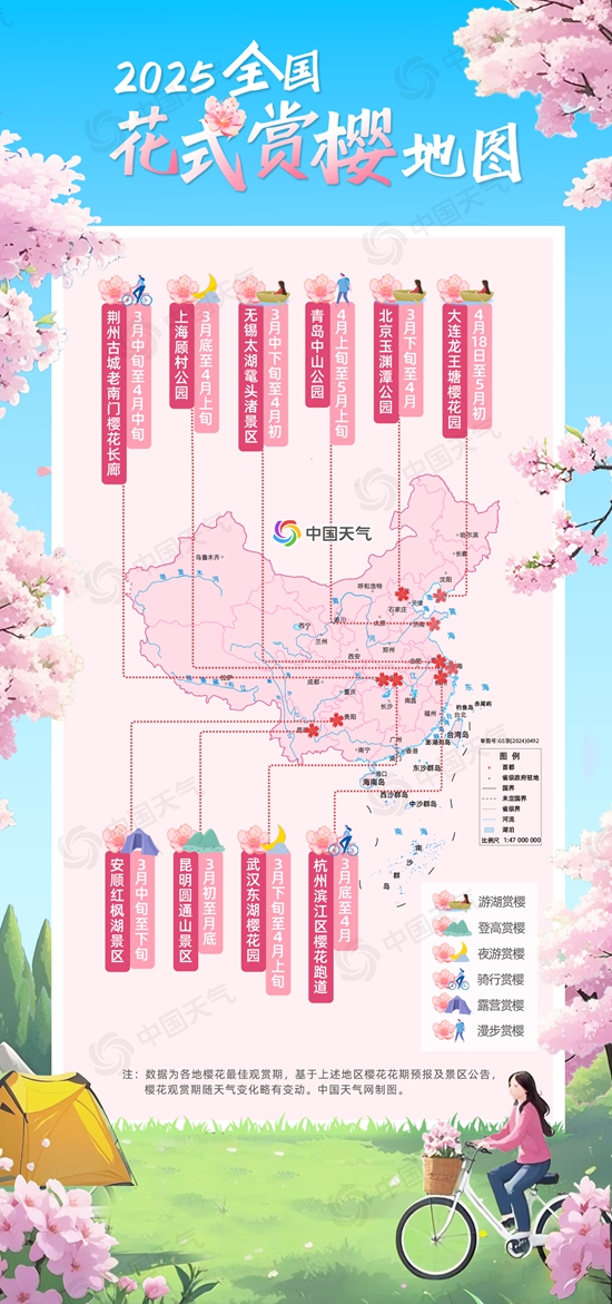 “櫻花紅陌上,柳葉綠池邊。”又是一年櫻花季!今年3月中下旬以來,我國大部經(jīng)歷了大回暖,催動春花盛放,目前武漢、南京等地櫻花已進入盛花期,北方多地櫻花也開始迎來觀賞期。中國天氣網(wǎng)特別推出2025全國花式賞櫻地圖,盤點十大賞櫻勝地最佳觀賞期和花式玩法,快來開啟你的賞櫻之旅吧。